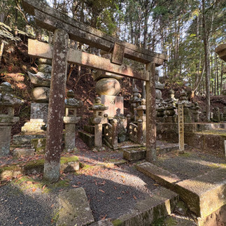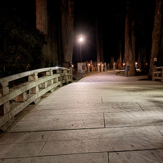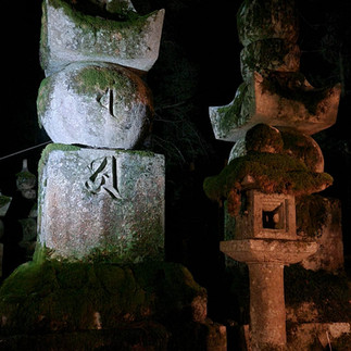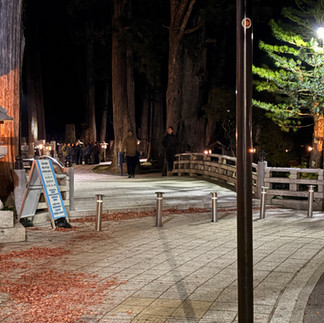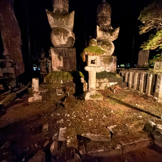 We bezochten met een monnik het beroemde Okunoin kerkhof wanneer het donker was. De weg door het kerkhof wordt verlicht door stenen lantaarns die vaak begroeid zijn met mos. In het kerkhof staan talloze beelden en grafmonumenten. Heel opvallend zijn de eeuwen oude cederbomen die reusachtig en allen beschermd zijn door de staat. De weg leidt uiteindelijk naar het mausoleum van Kobo Daichi.